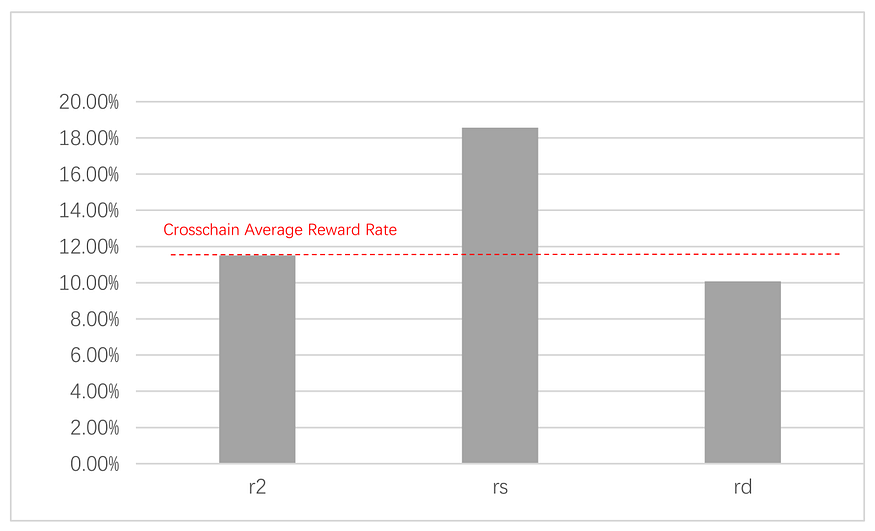 r1 denotes reward rate of PoS consensus, r2 denotes reward rate of crosschain, and αdenotes zoom coefficient. In the initial stage, we set α=1.5, which means the average reward rate of crosschain is 1.5x that of PoS consensus. At present, r1=7.67%, so we have r2=11.5%.