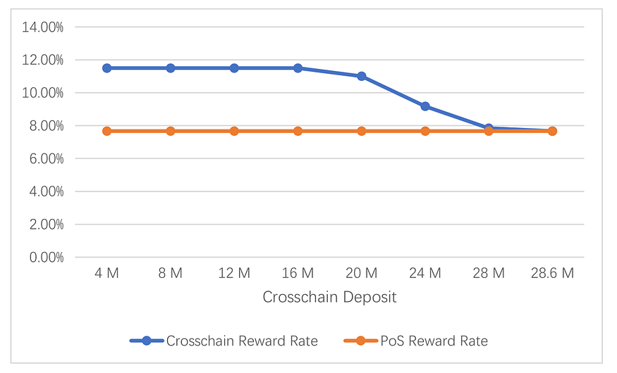 In summary, the cross-chain reward rate is higher than the PoS consensus reward rate in the initial stage, which encourages the development of the cross-chain ecosystem. As cross-chain deposits grow, the cross-chain reward rate decreases due to the hard cap. An equilibrium will be reached when the cross-chain and PoS reward rates are equal.