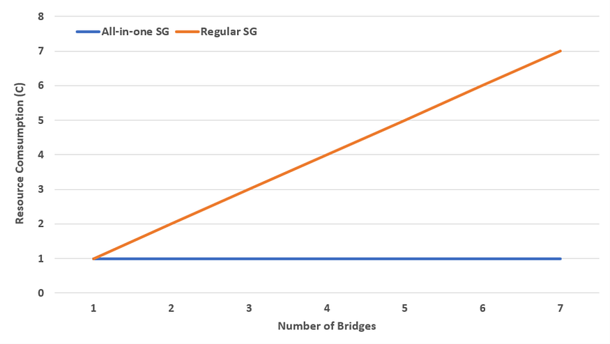 In Wanchain 5.0, the locked account is generated jointly by the members of the Storeman group, which is denoted as the KeyGen process. This process requires all the members to participate and is both time and computationally consuming. Specifically, the total runtime and computation resource consumption grows linearly as the number of bridges increases. Using the shared Storeman group, only one KeyGen process is required, for the locked account is shared by the bridges. Thus, the total runtime and computation resource consumption remains constant as the number of bridges increases. Assuming the resource consumption in building one direct bridge is C, then the relationship of the total resource consumption and the number of building bridges is shown in Figure 5 above. Per this graph, the resource consumption for a regular storeman group increases in proportion to the number of bridges while the consumption for a shared storeman group remains constant.