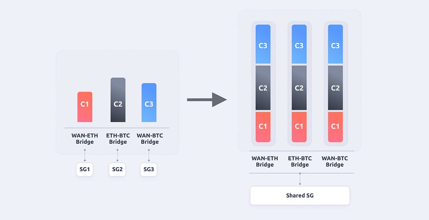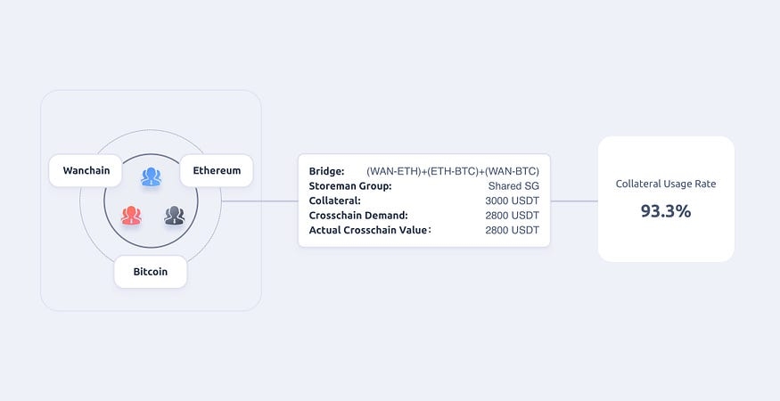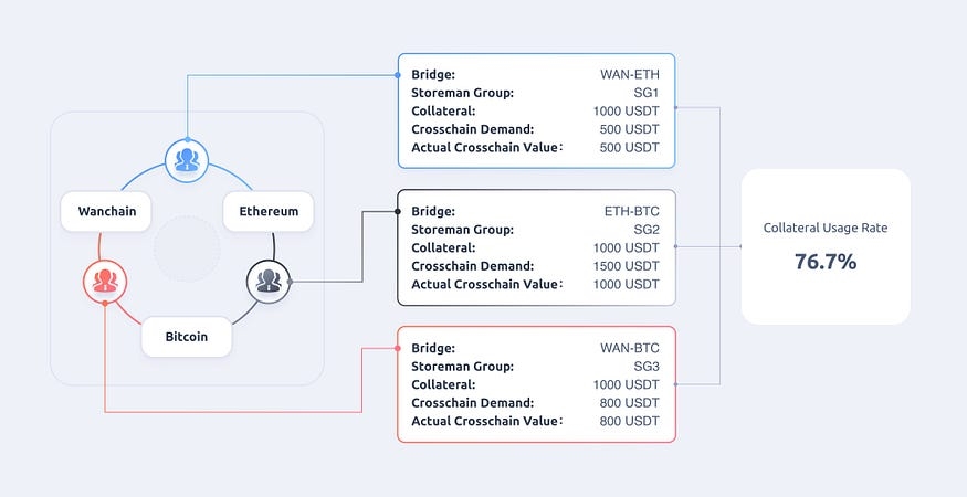 Through the shared Storeman group, all the bridges share the same collateral pool. While the total cross-chain capacity remains unchanged, the maximum cross-chain capacity for a single bridge increases to the value of the total collateral. This improvement helps us handle the situations where the value of cross-chain assets exceeds the collateral behind a single bridge.