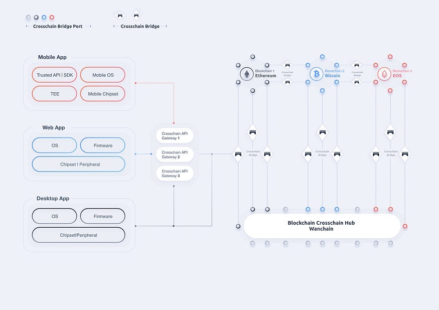Wanchain Universal Crosschain platform is depicted in Figure 1 with the following components: a) set client devices such as a handheld mobile device, a device having a web browser, or a desktop with applications; b) a cross-chain API gateway that is connected to client devices and various blockchains, bridges, and blockchain hubs; c) homogenous or heterogeneous blockchains; and d) universal cross-chain bridges that connect blockchains to provide native or cross-chain transactions. Cross-chain API gateways as shown in the diagram may be implemented with different technologies. For example, an API gateway may have an HTTP server as a front end that communicates with client devices. In another embodiment, the API gateway may have a peer-to-peer connection with a client device and receives messages from the clients. The API gateway may also implement a load balancing server to increase the scalability and reliability of the gateway. The backend of the API gateway connects to native blockchains, bridge links, or blockchain hubs. A native blockchain is a blockchain that supports single chains and protocols, such as bitcoin, Ethereum, quorum, EOS, tron, corda, ripple, and hyperledger. A blockchain hub is a blockchain that has functions to perform cross-chain operations to transfer and aggregate assets, data, and value across blockchains. Blockchains such as Wanchain, Polkadot, and Cosmos may be classified as blockchain hubs.
