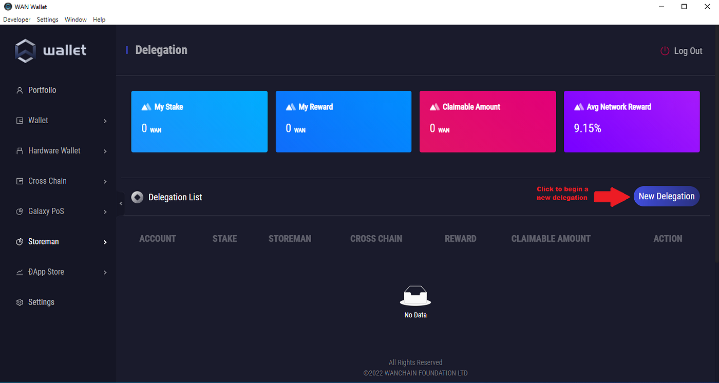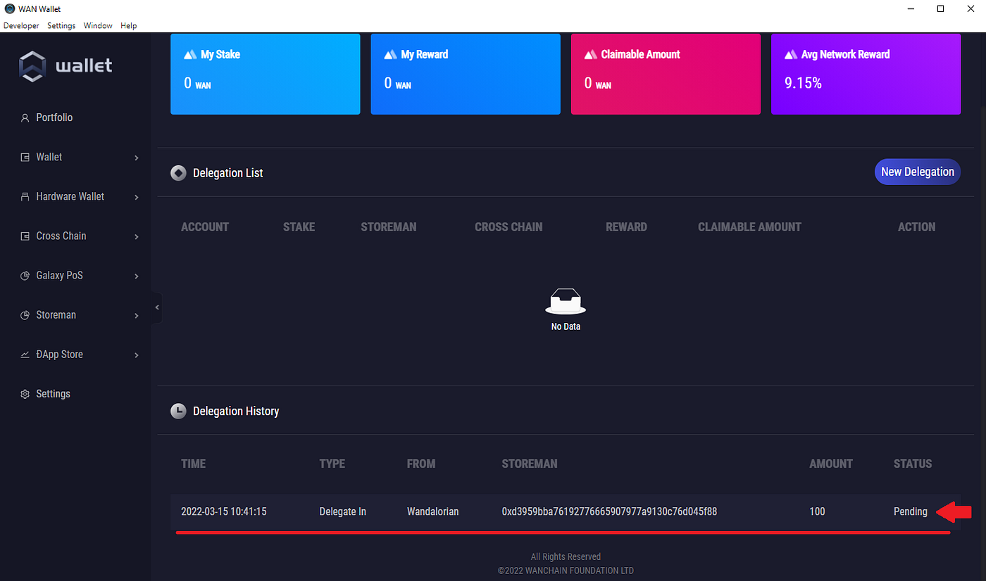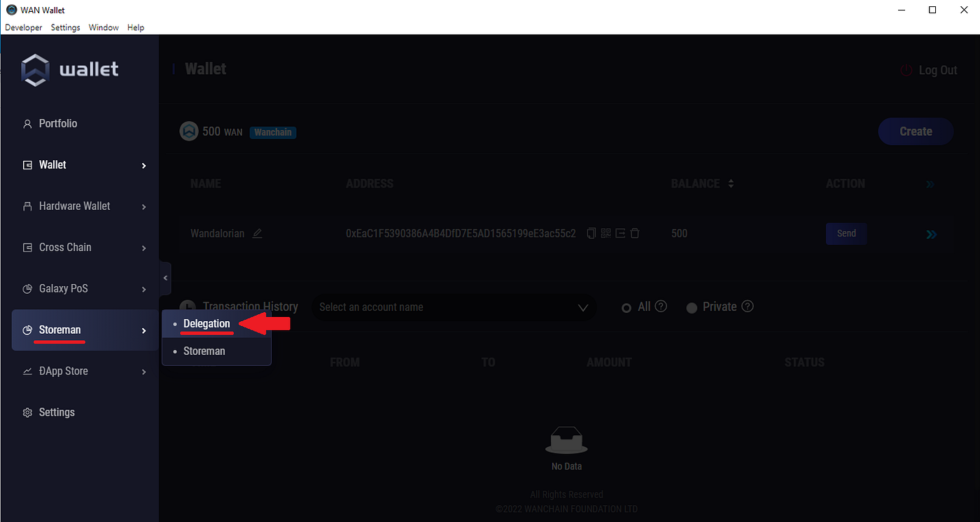 Once you have deposited some $WAN on your address, use the menu on the left to navigate to Storeman β†’ Delegation, as in the screenshot below.