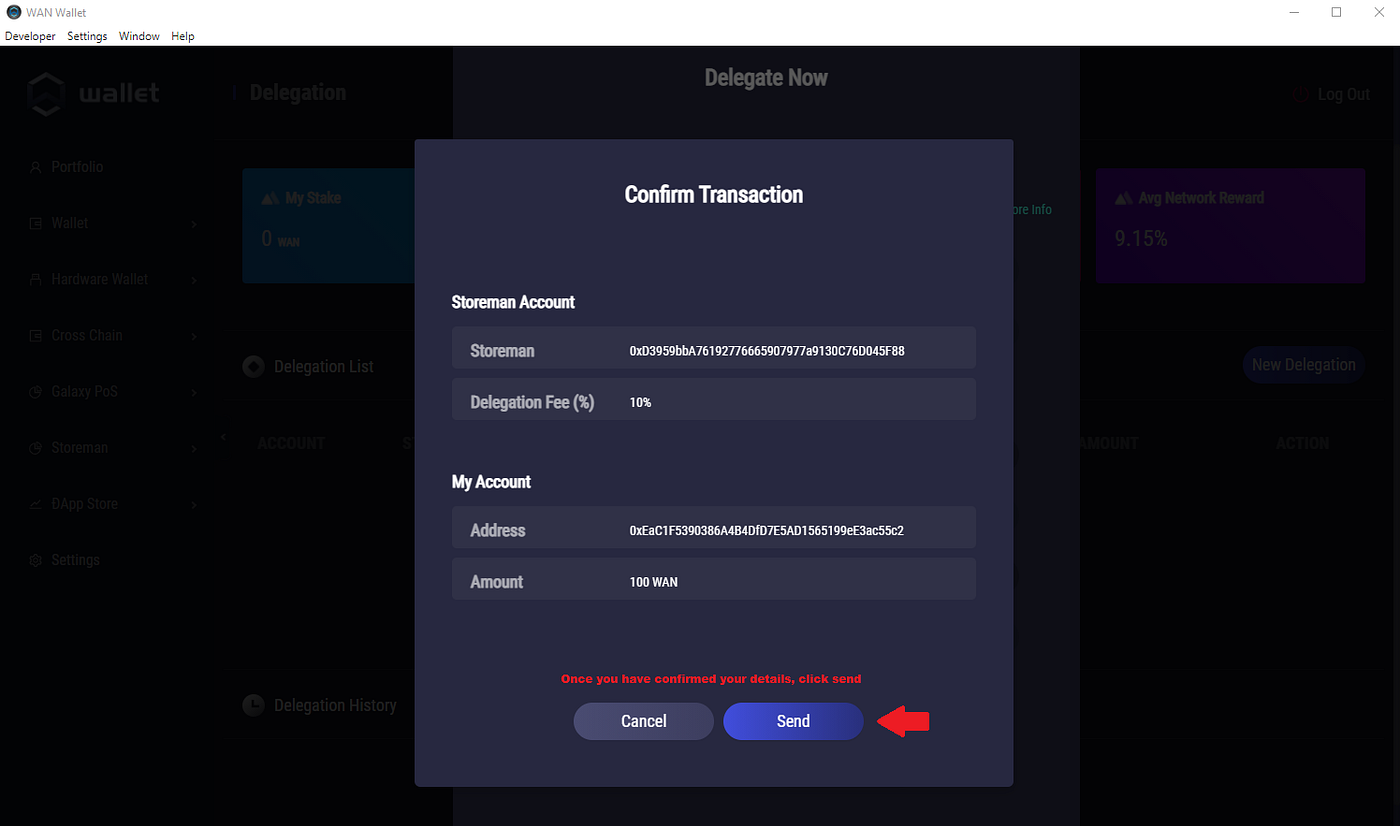 After confirming your details, click β€œSend” to start delegating your $WAN to the Bridge (Storeman) Node you selected.