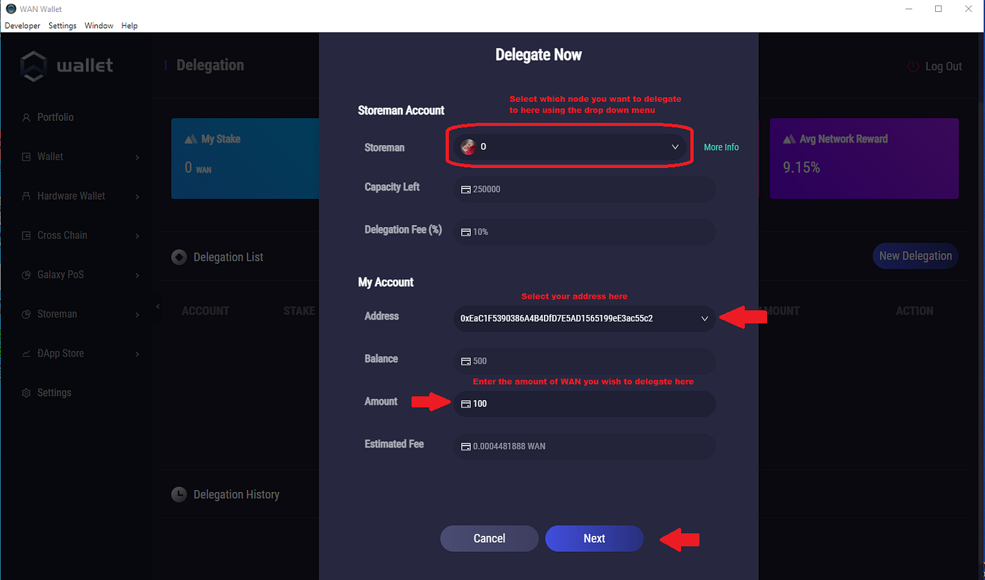 Select a node from the Storeman drop-down list, select your address on the address list, input the amount of $WAN you wish to stake then click β€œNext”.
