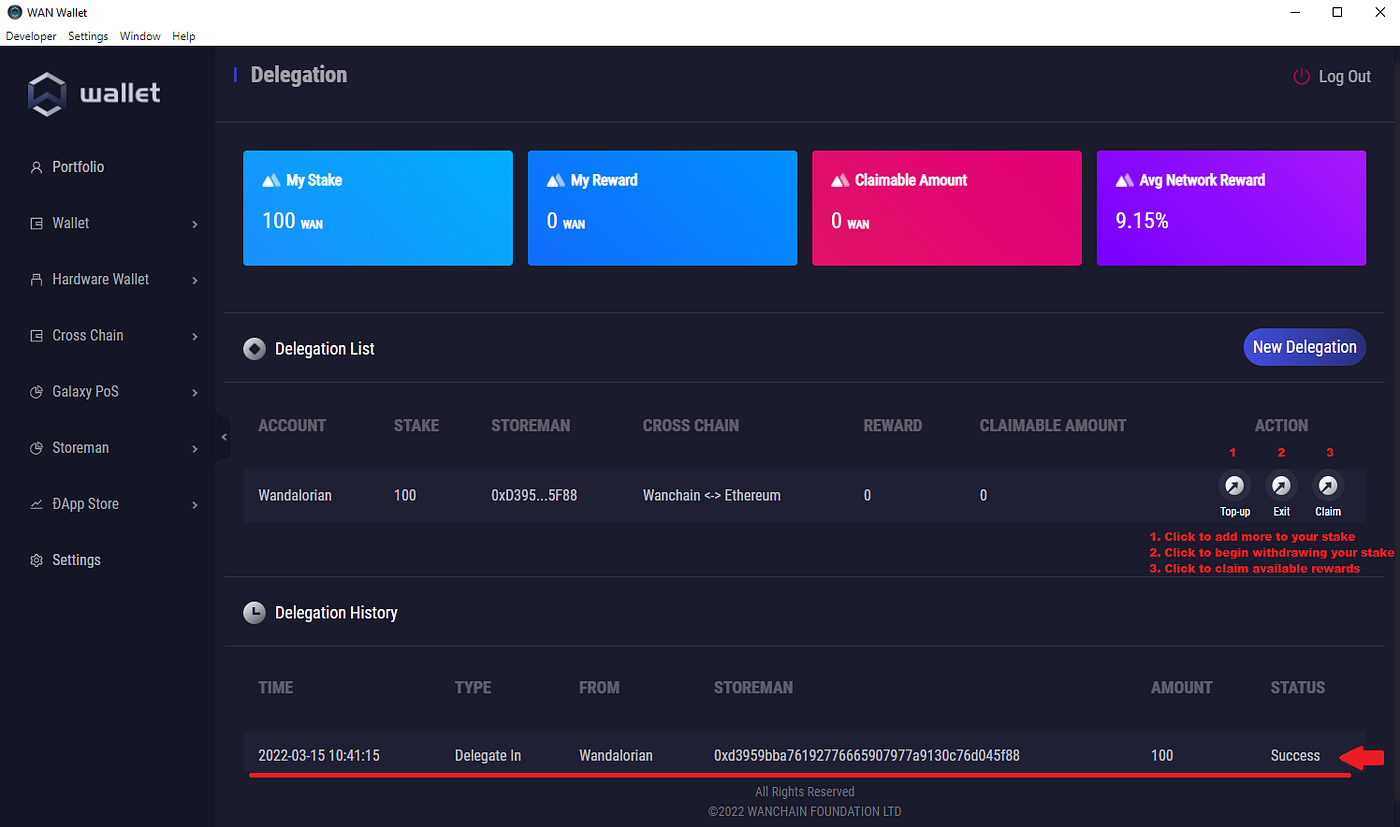 As shown in the screenshot above, you can click β€œTop-up” to add more $WAN to your delegation. Click β€œExit” to withdraw your staked $WAN and β€œClaim” to claim your $WAN rewards. You can also click β€œNew Delegation” if you wish to start a new delegation to a different Bride (Storeman) Node.