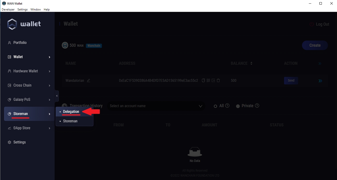 Once you have deposited some $WAN on your address, use the menu on the left to navigate to Storeman → Delegation, as in the screenshot below.