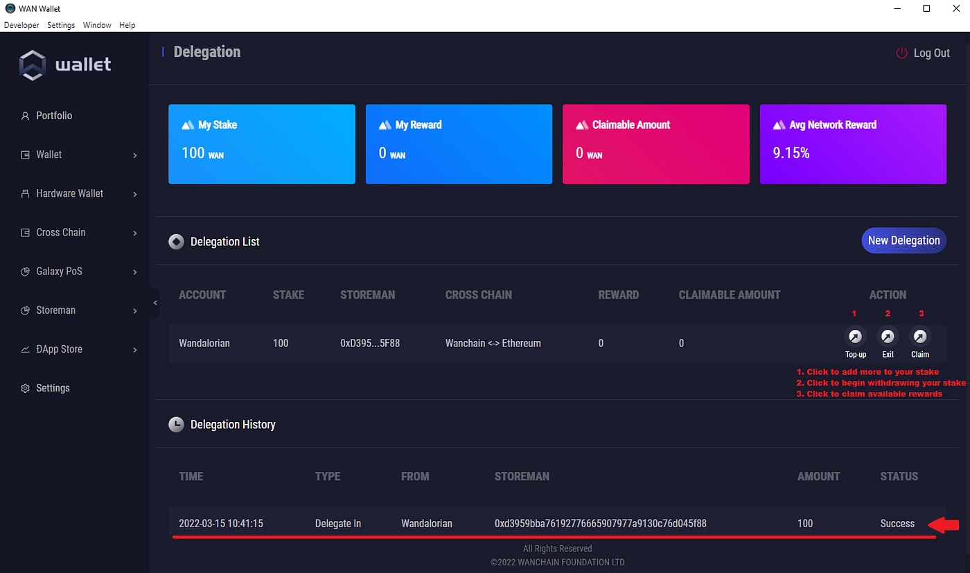 As shown in the screenshot above, you can click “Top-up” to add more $WAN to your delegation. Click “Exit” to withdraw your staked $WAN and “Claim” to claim your $WAN rewards. You can also click “New Delegation” if you wish to start a new delegation to a different Bride (Storeman) Node.