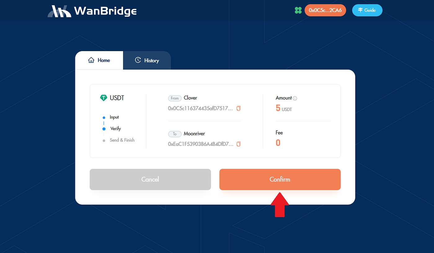 Step 3: Initiate a crosschain transaction to move your $USDT from Clover to Moonriver.
