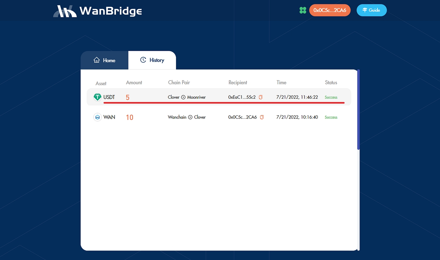 Once your crosschain transaction is complete, you’ll see your $WAN balance on CLV (called $WAN) and the crosschain transaction status change to “success”.