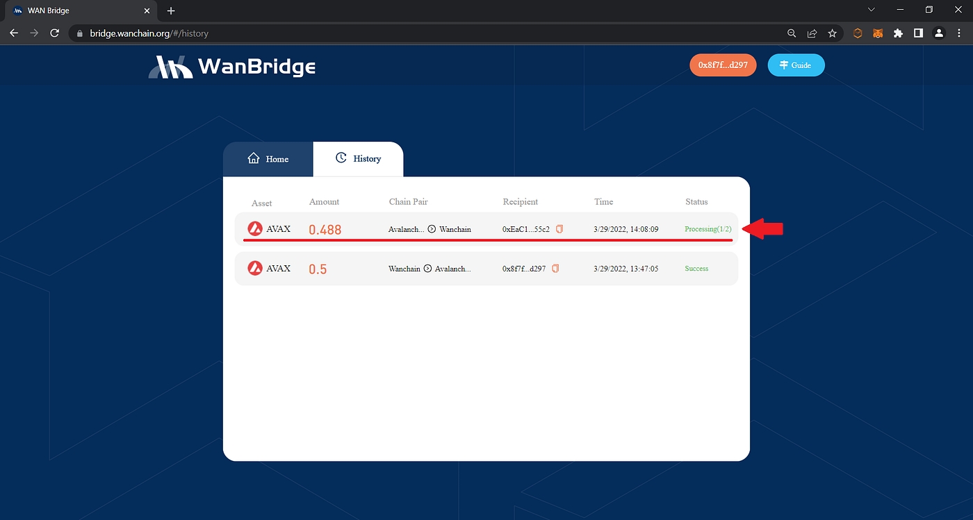 Once your crosschain transaction is complete, you’ll see your $AVAX balance on Wanchain (called $wanAVAX) and the crosschain transaction status change to “success”.
