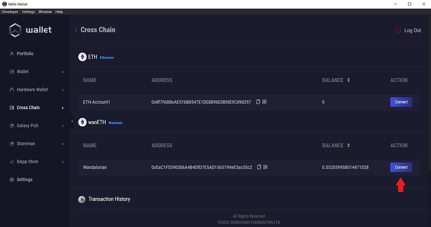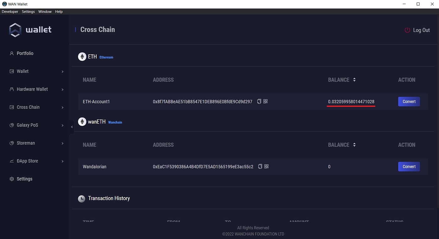 Since you are moving $ETH from Wanchain to Ethereum, click “Convert” next to your wanETH balance, as in the screenshot below. $ETH on Wanchain is called $wanETH.