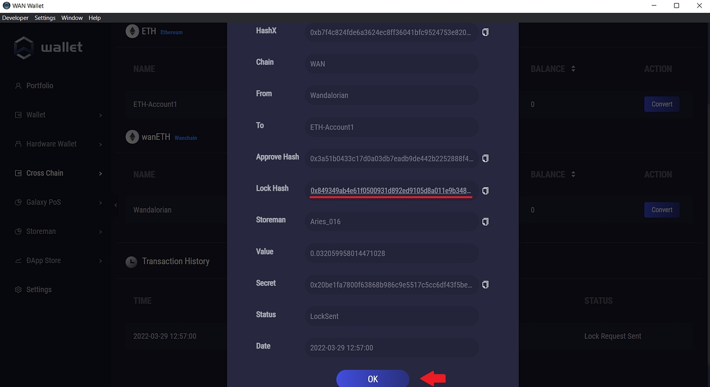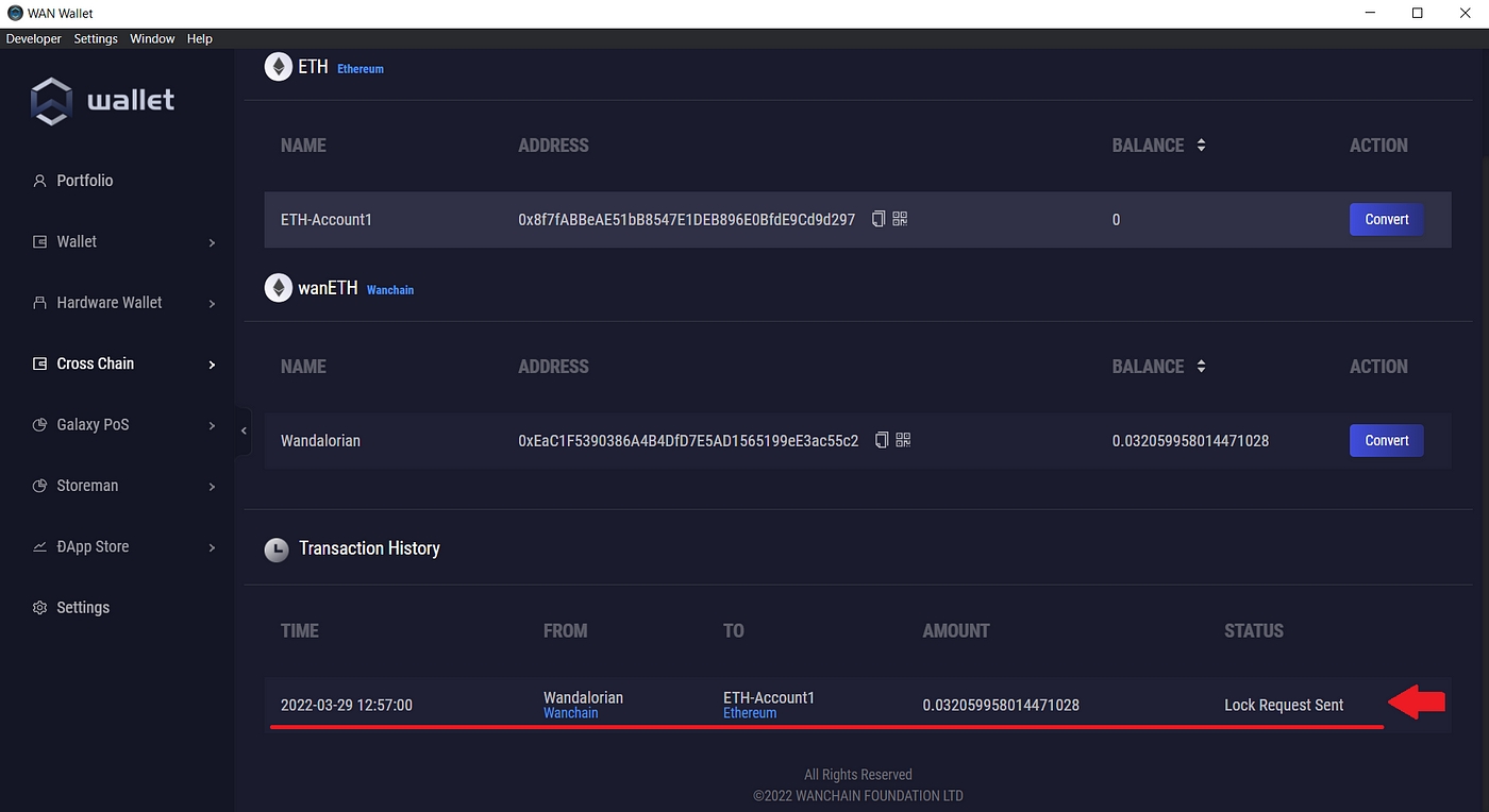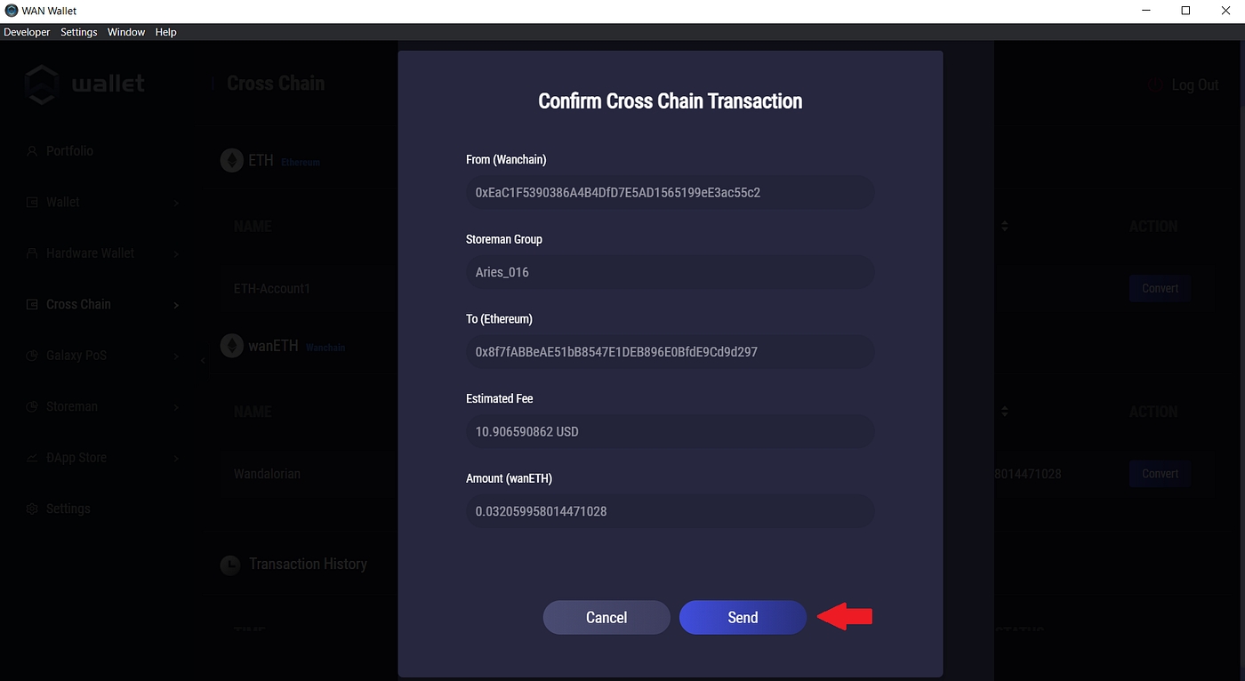 Step 2: Initiate a crosschain transaction to move your $ETH from Wanchain to Ethereum.