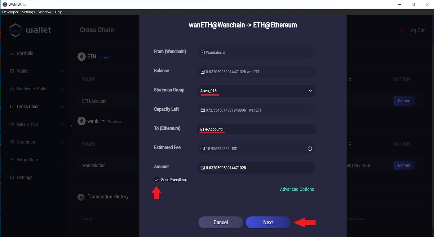 Select which of your $ETH wallets you would like to receive the $ETH on Ethereum, enter the amount of $wanETH to convert, then click “Next”. Optionally, you can select “Send Everything” to move your entire $wanETH balance to Ethereum.
