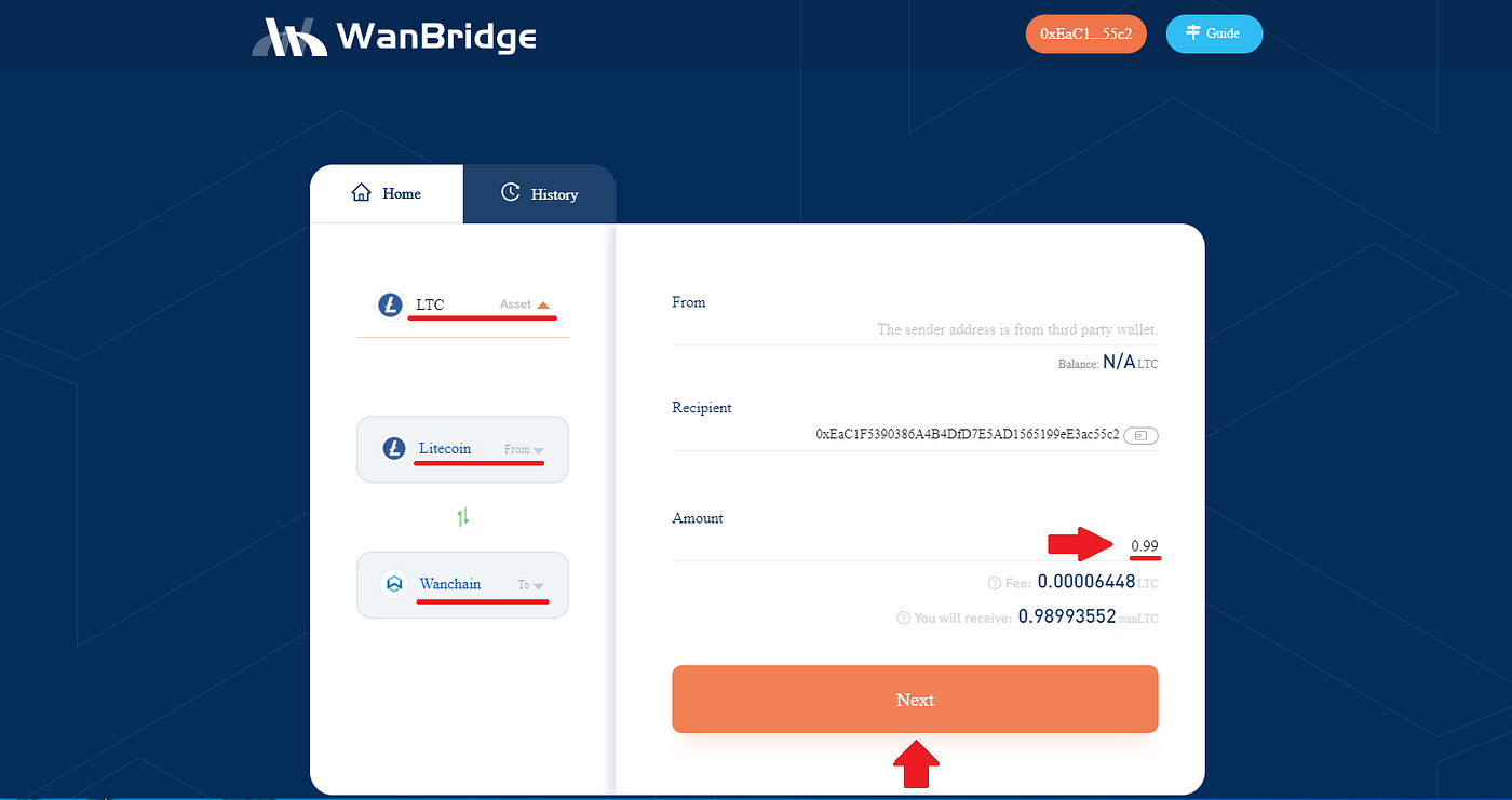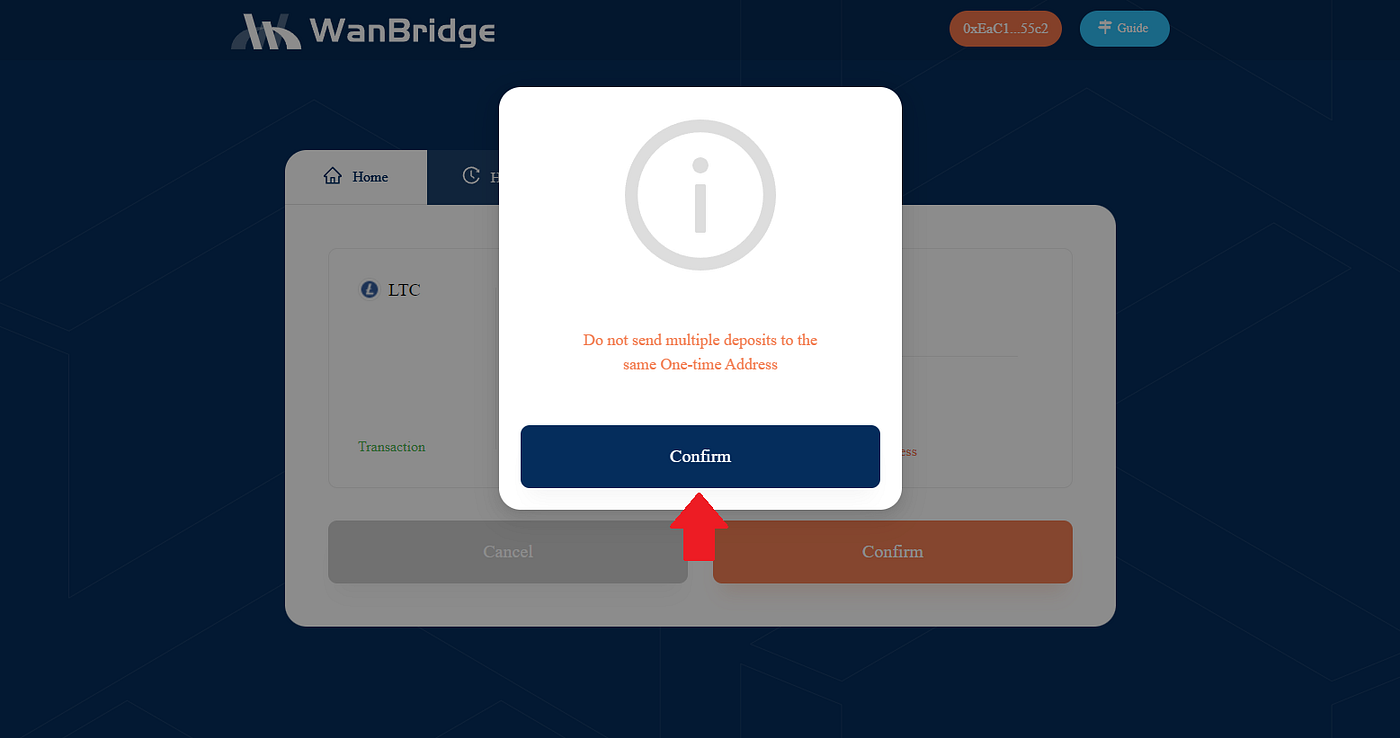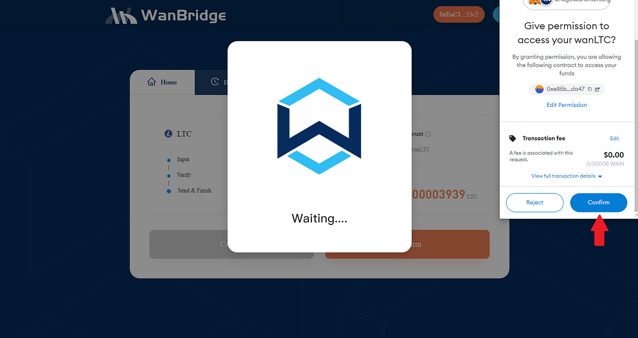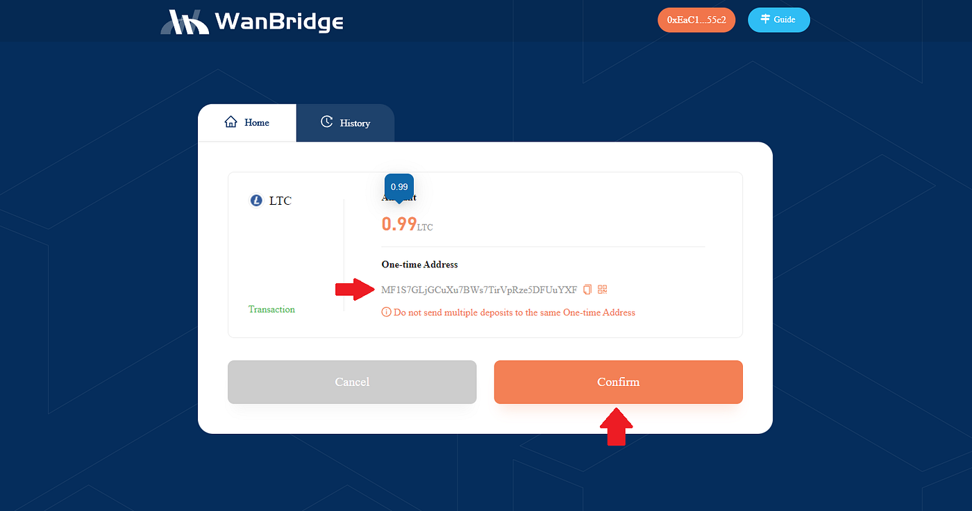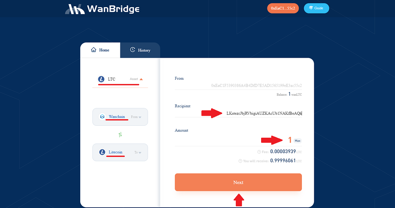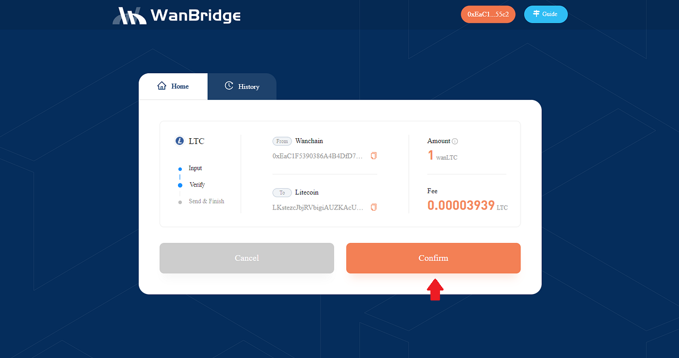 Step 3: Initiate a crosschain transaction to move your $LTC from Wanchain to Litecoin.