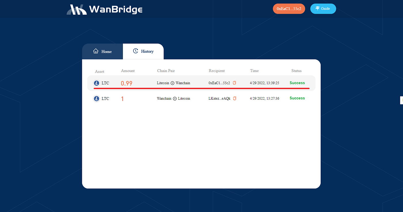 Wanchain to Litecoin crosschain transactions using the WanBridge web portal