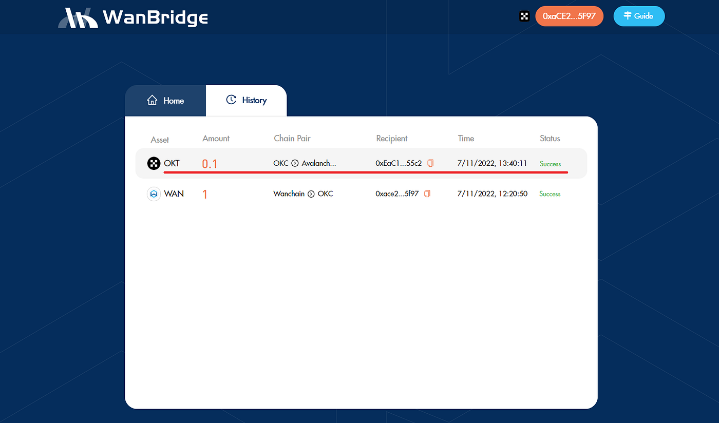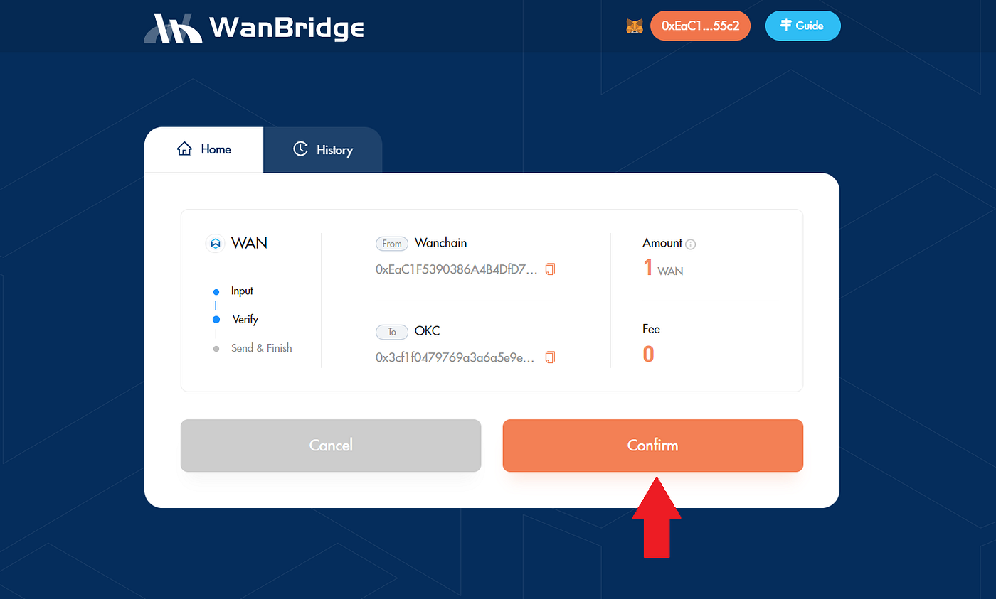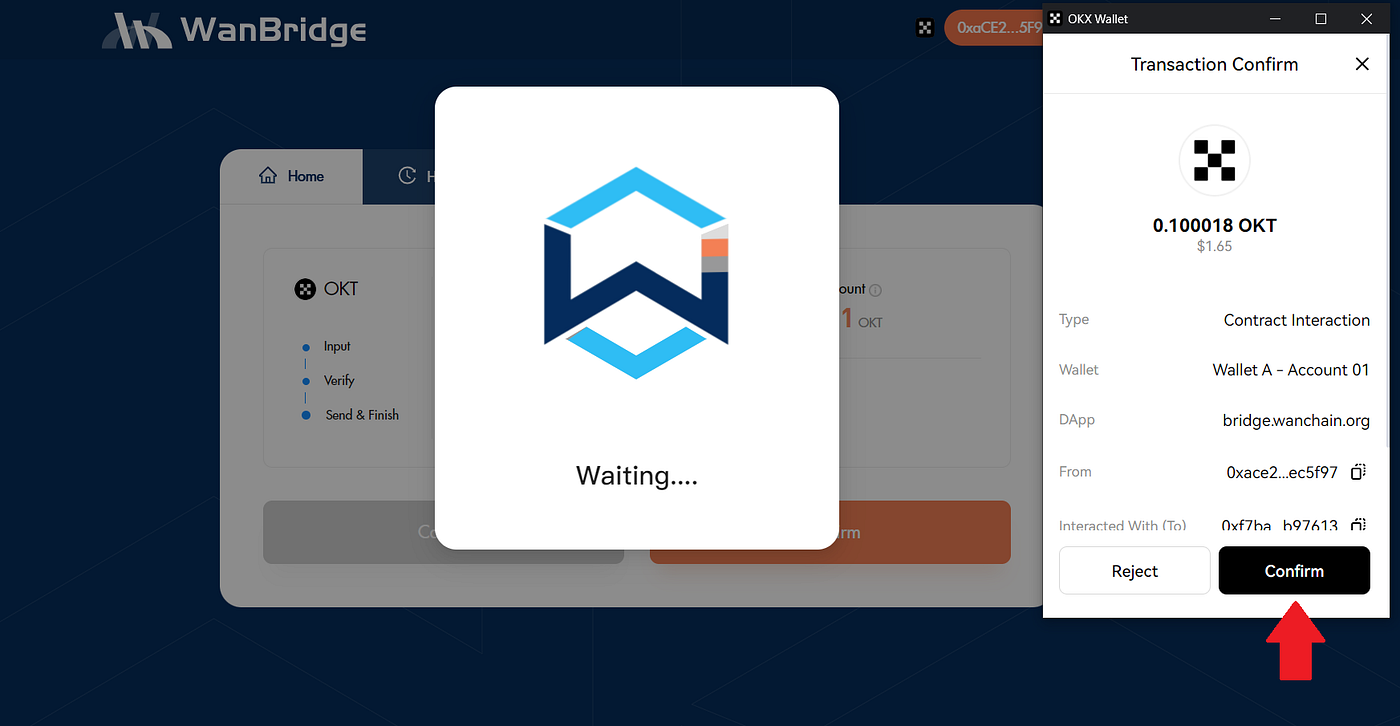 Step 3: Initiate a crosschain transaction to move your $WAN from Wanchain to OKC.