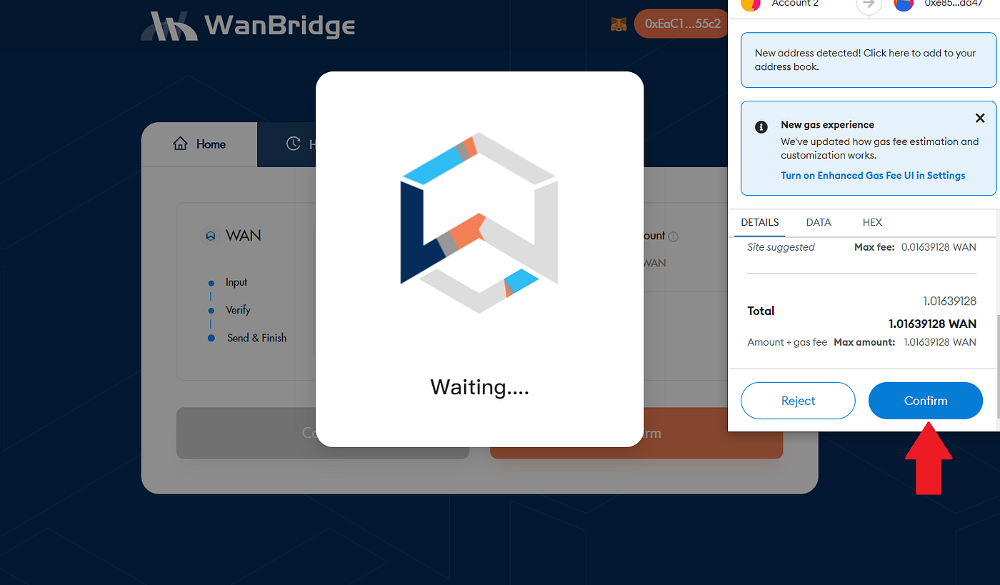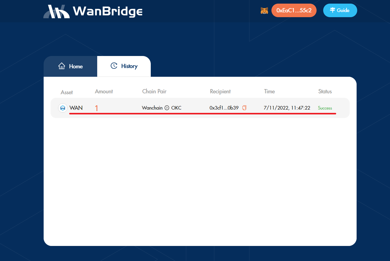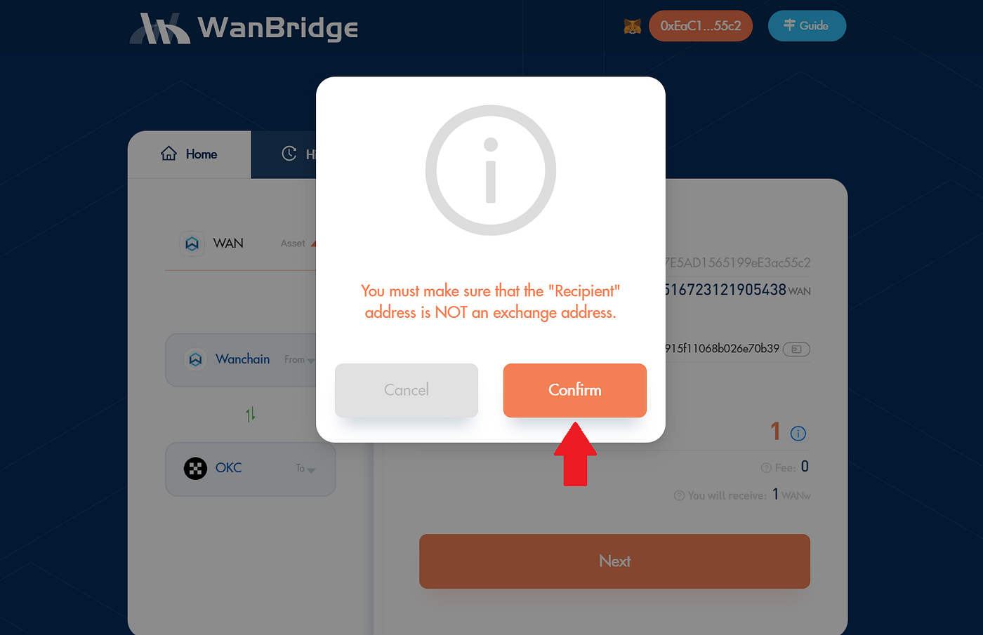 Step 3: Initiate a crosschain transaction to move your $WAN from Wanchain to OKC.