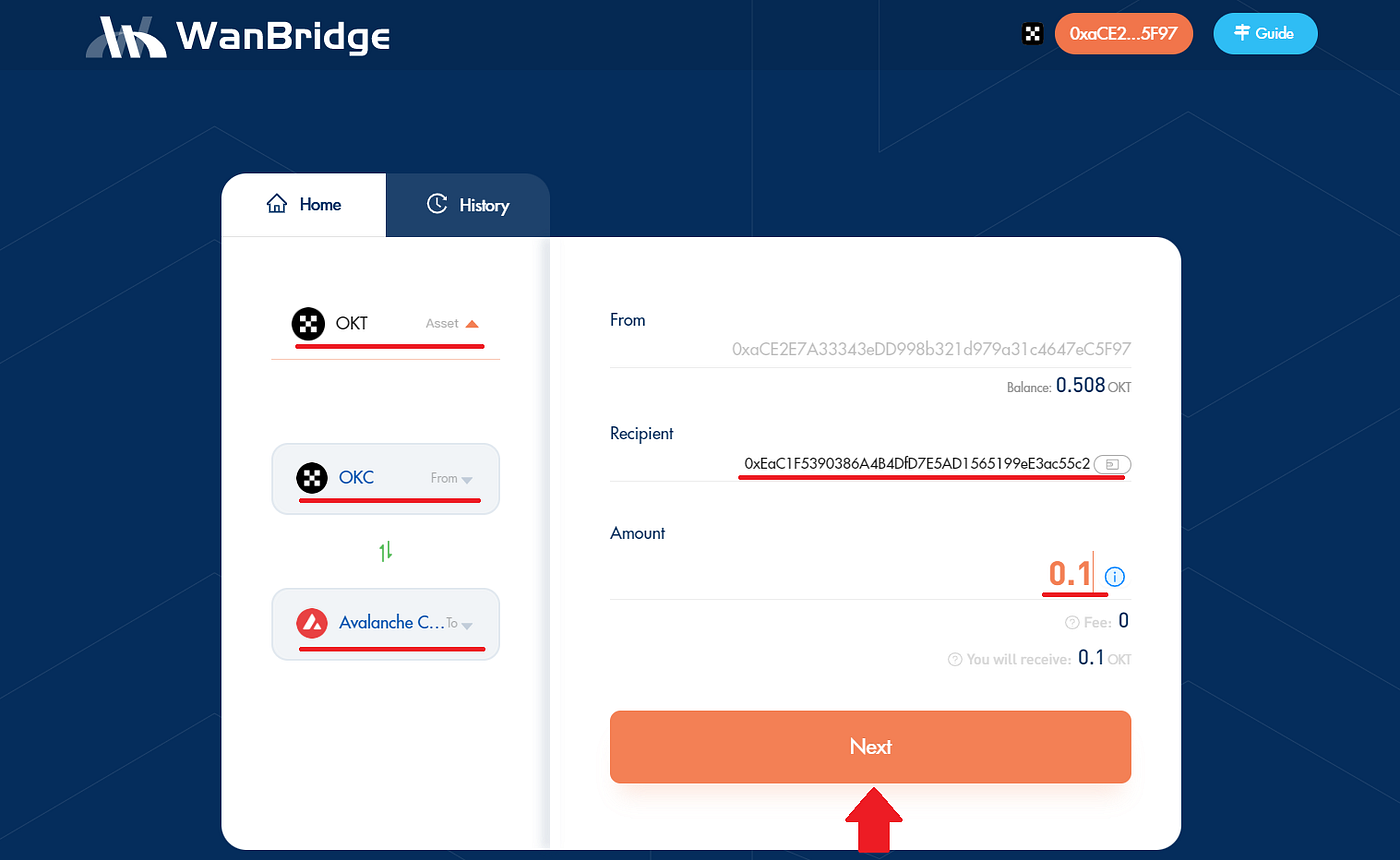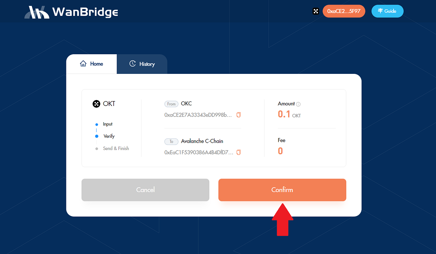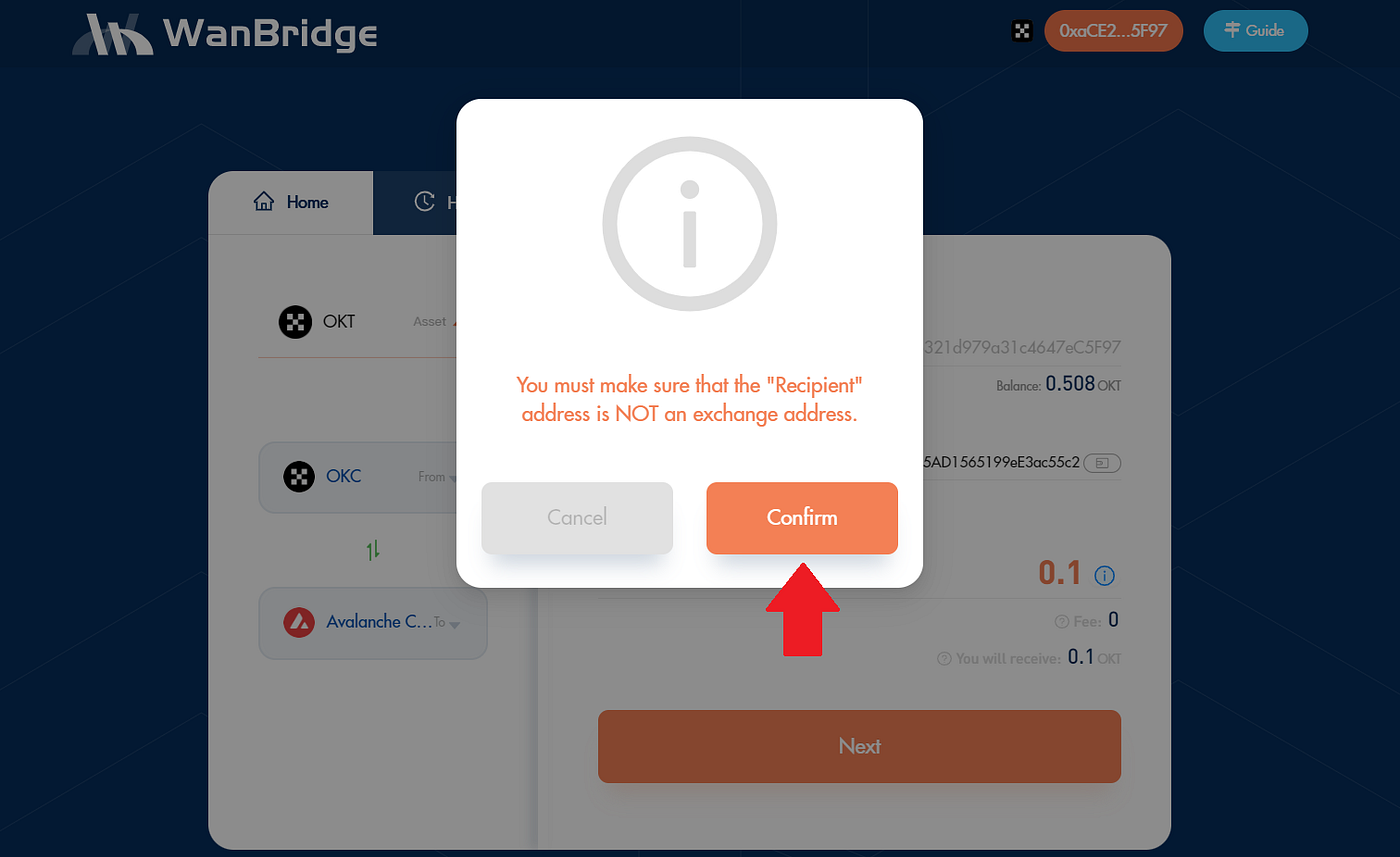 Step 3: Initiate a crosschain transaction to move your $OKT from OKC to Avalanche.