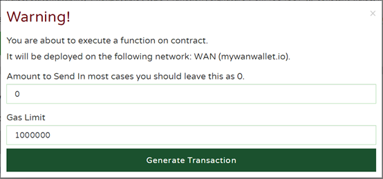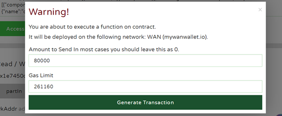 Enter the number of WAN (at least 10,000) you want to partner in with, and after the Gas Limit is automatically refreshed (wait until it does not show -1), click the “Generate Transaction” button. Then confirm the authorized transaction on the hardware wallet.