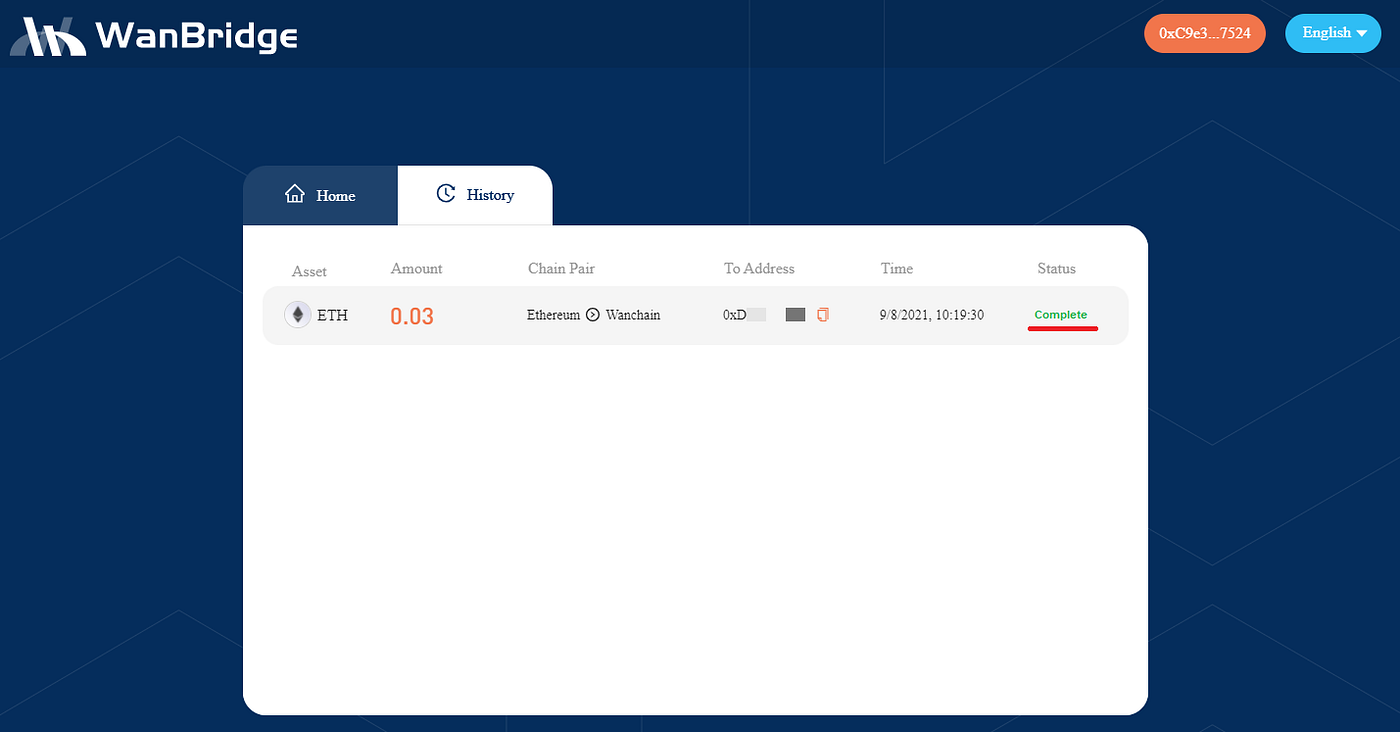 Congratulations! You have completed a crosschain transaction using Wanbridge Web!