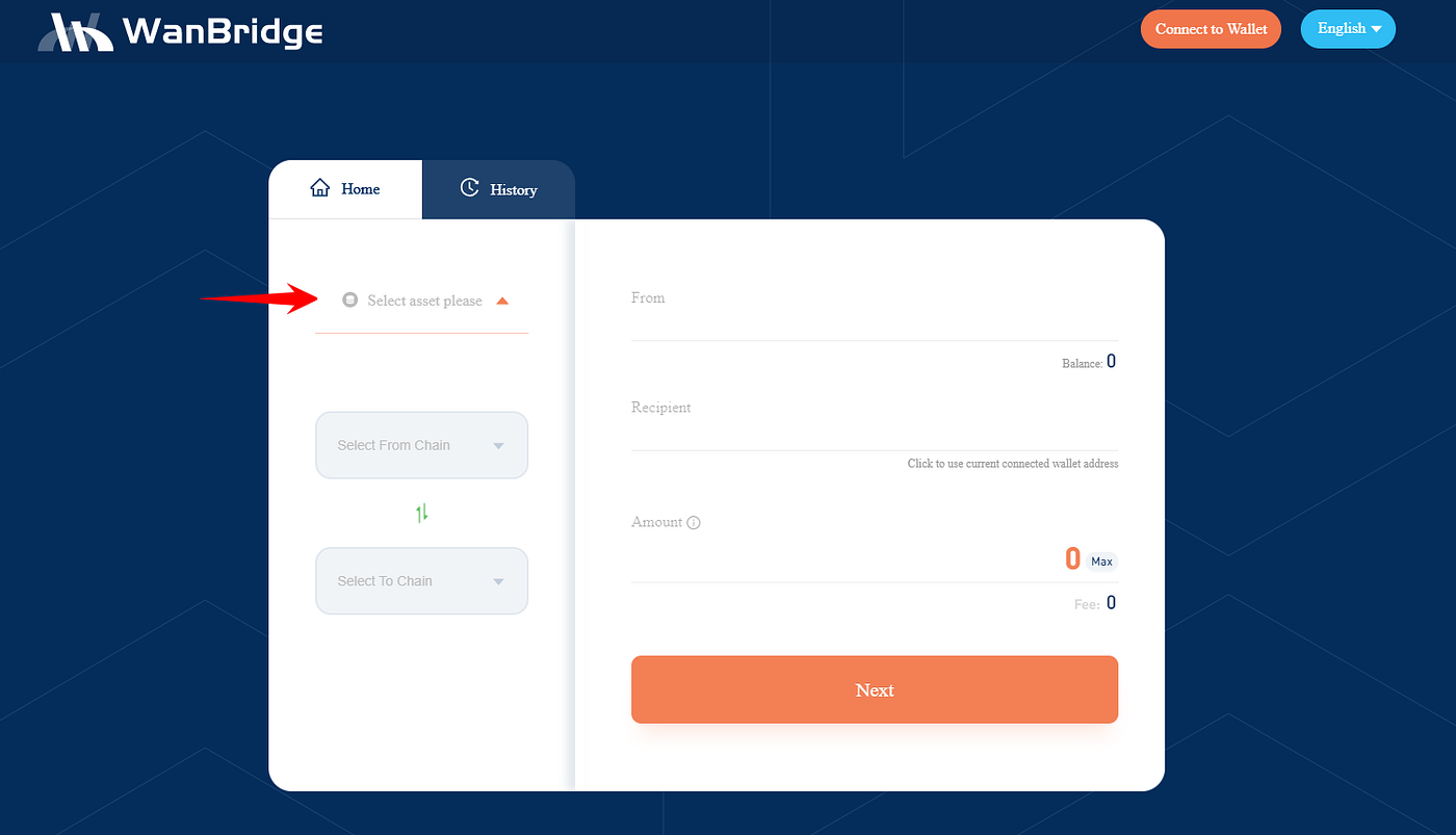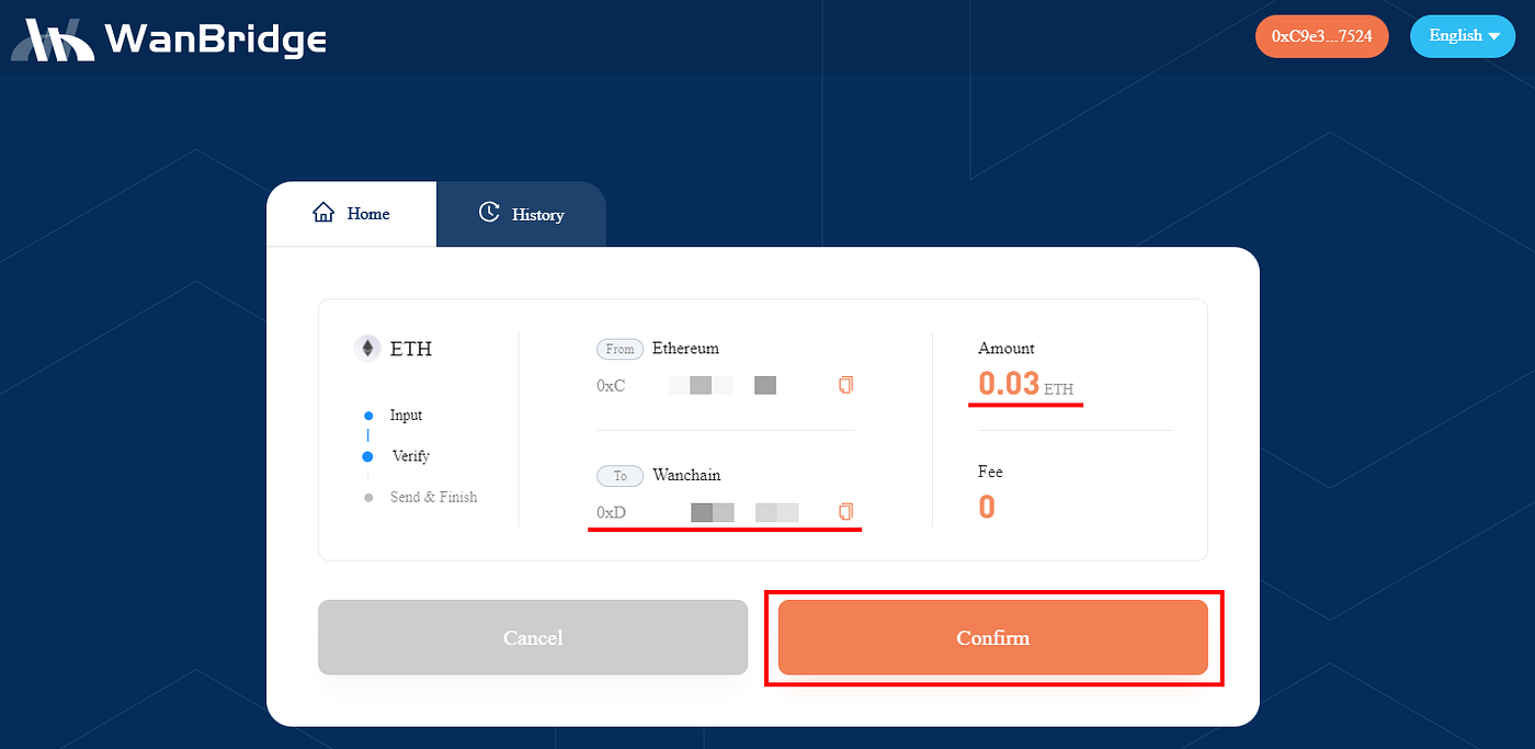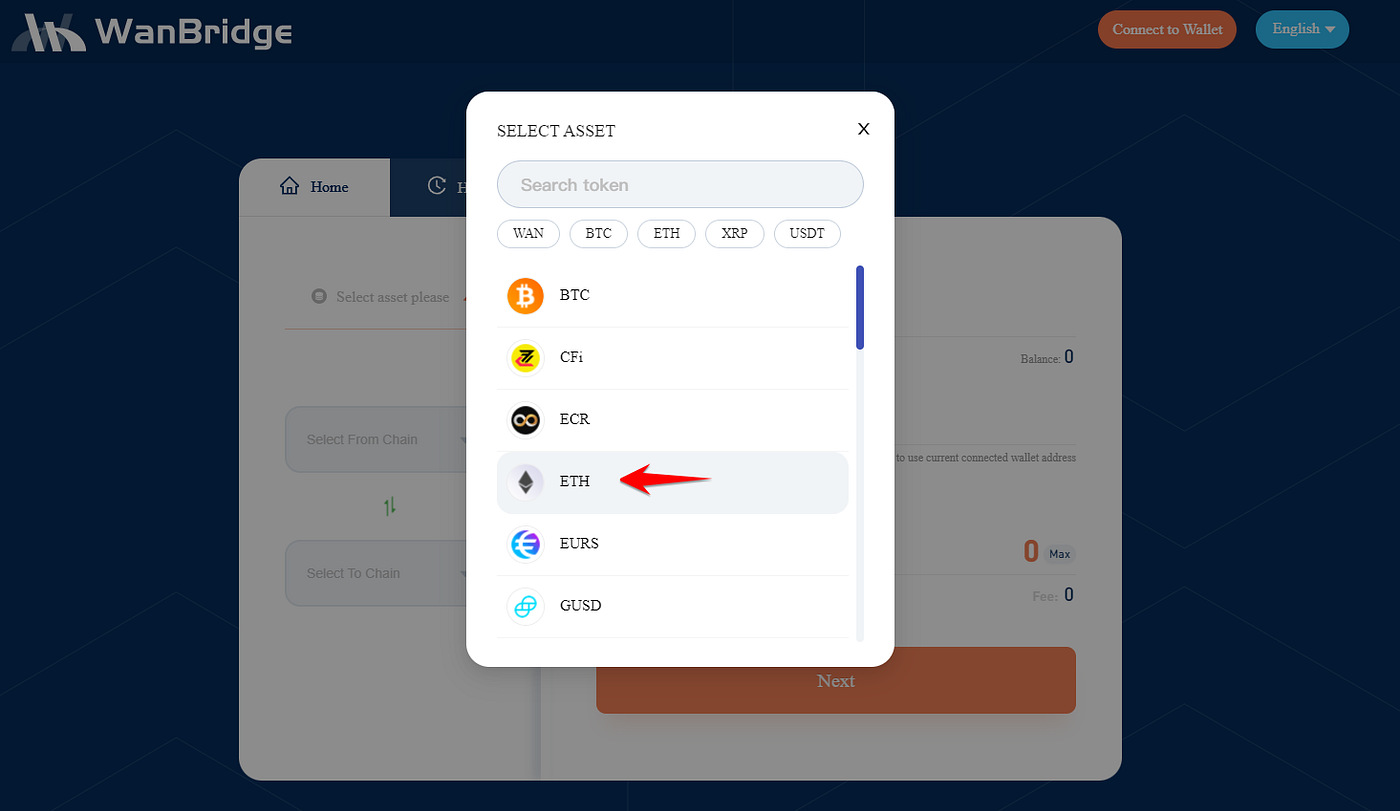 In this example, we are moving $ETH to Wanchain. So, Wanchain is the destination chain.