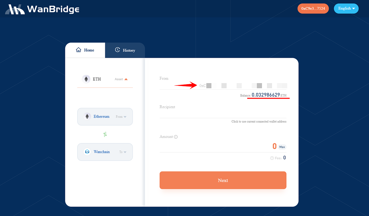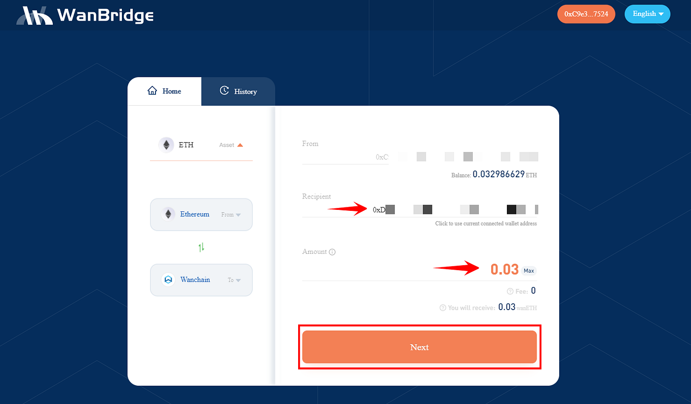 In this example, as we are moving $ETH to Wanchain, the Recipient address is a Wanchain address.