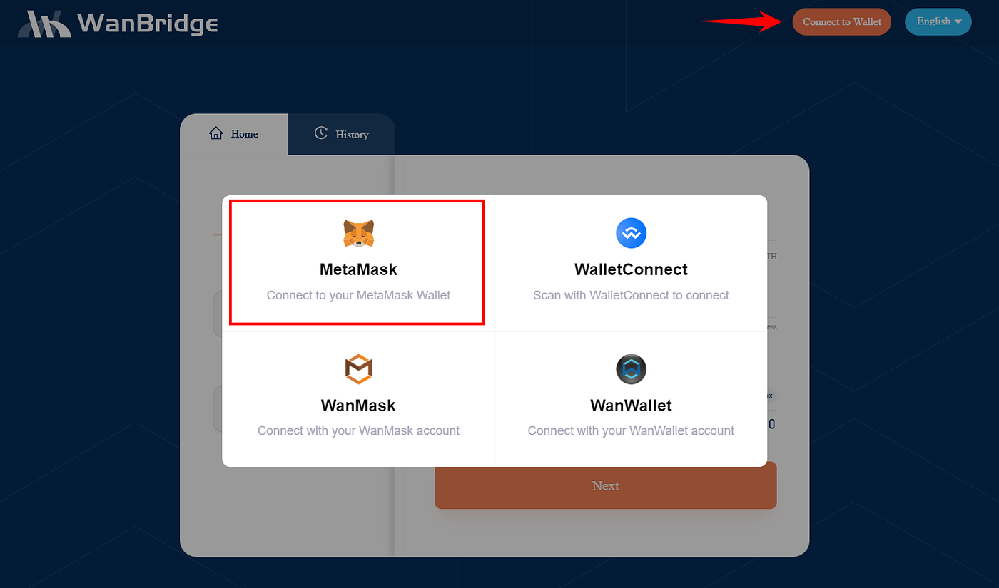 When connecting Metamask for the first time, you will need to click connect in the Metamask pop-up window. Your Ethereum wallet address will now be connected to WanBridge Web. Your ETH balance should also be visible.
