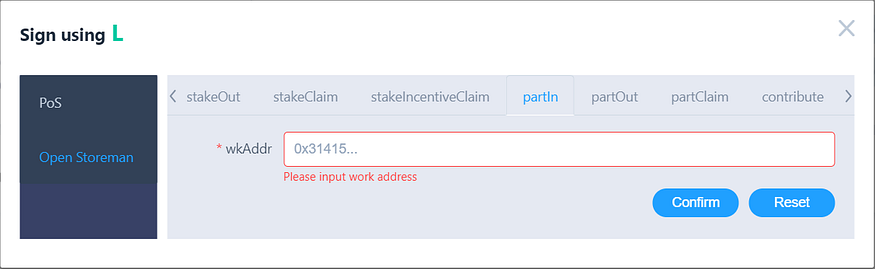 In the “wkAddr” field, enter the Work Address of the node you want to partner in to, then click the “Confirm” button.