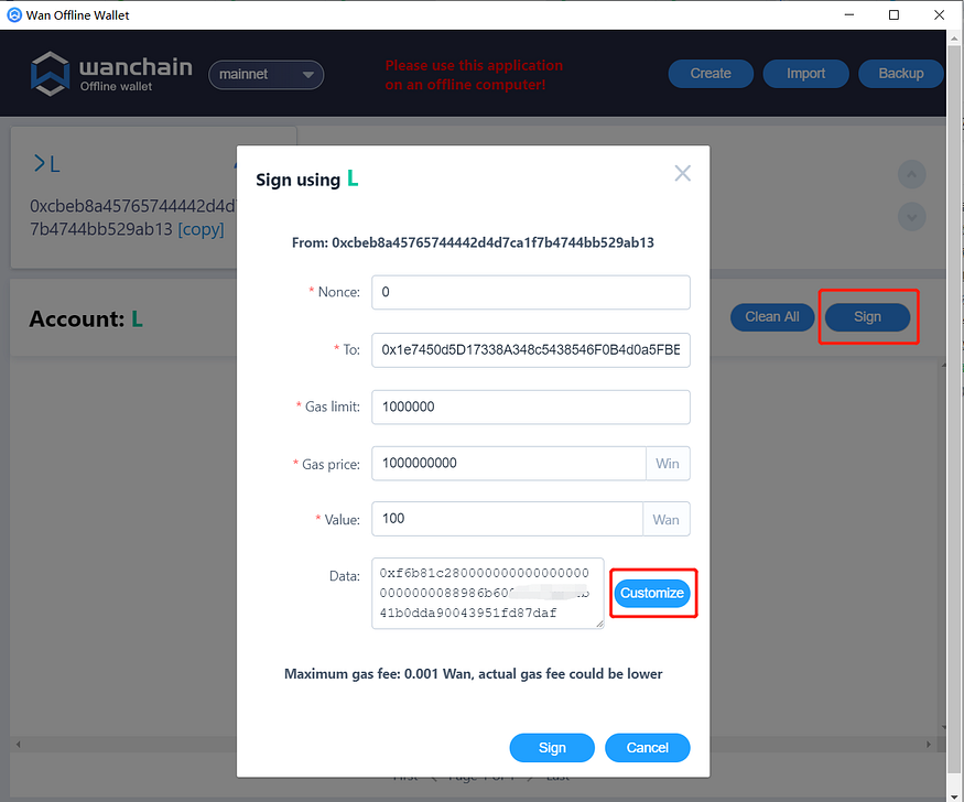Then change the value of Gas limit to 1000000. (At this time, the transfer fee should be 0.001 Wan)